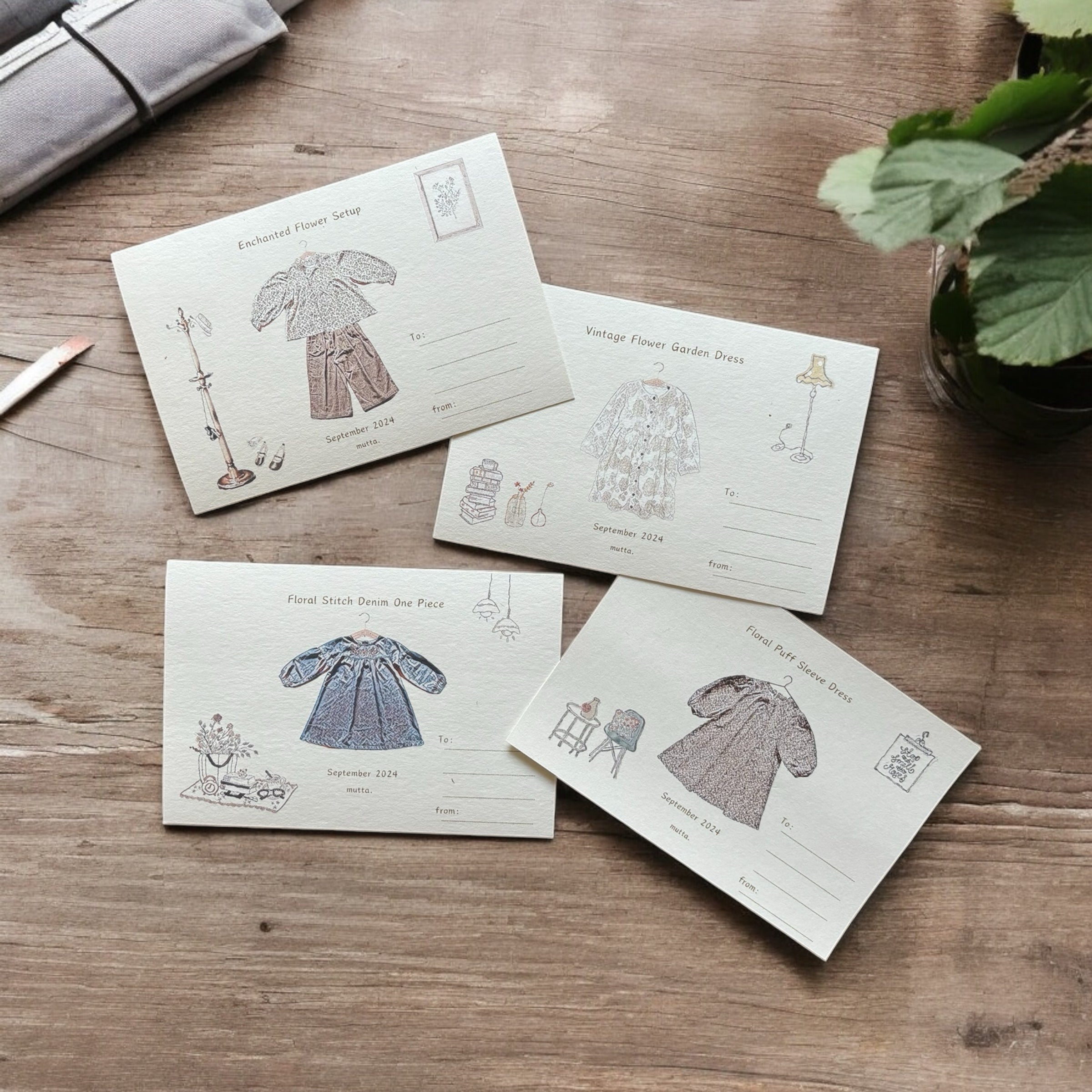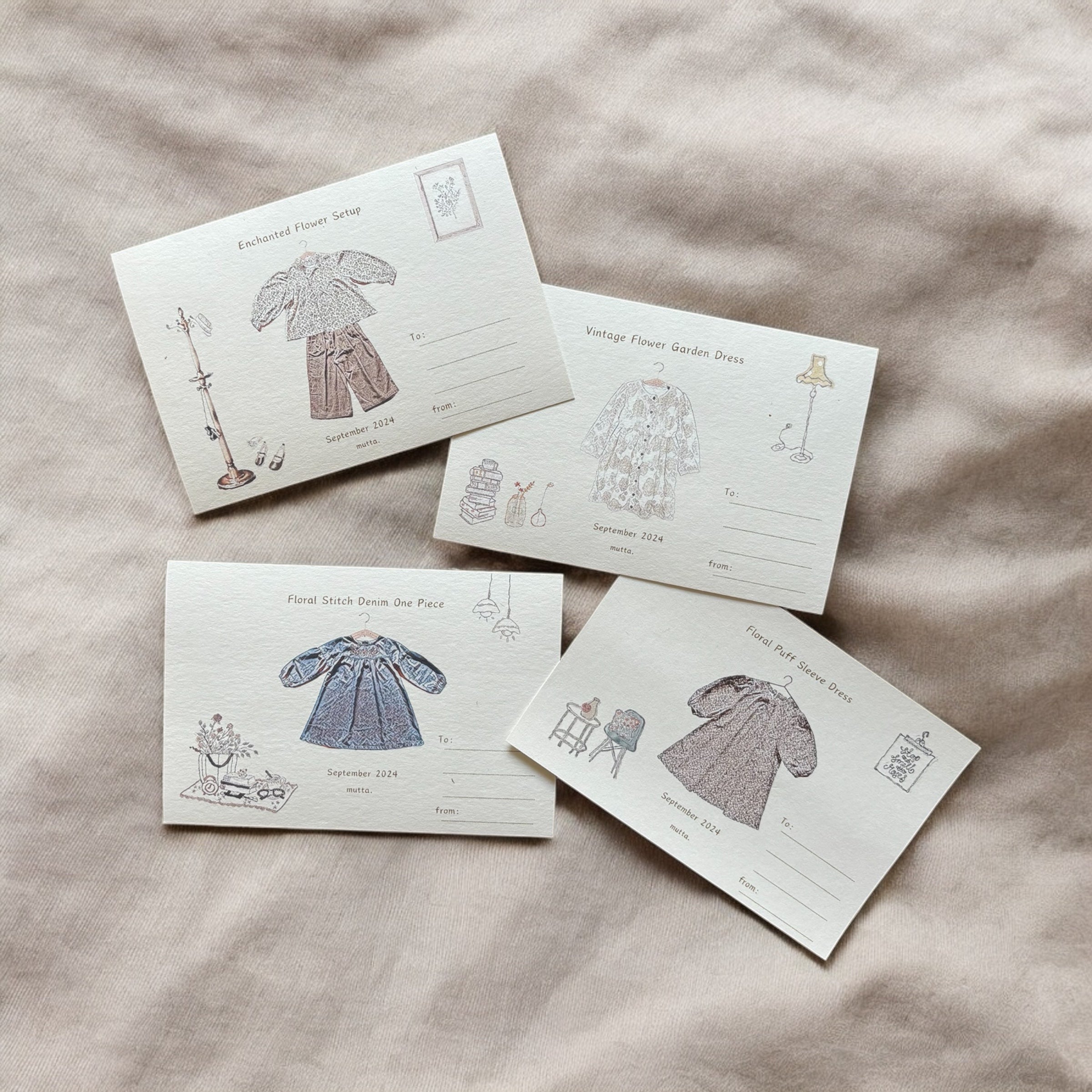 ポストカードのデザインには、mutta.の商品の洋服の特徴がしっかりと詰め込まれています。
