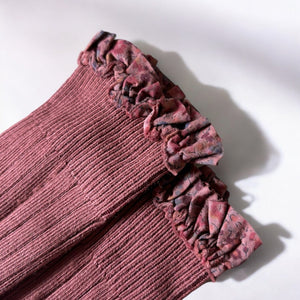 美しいバーガンディカラーと、トップ部分に施された花柄のフリルが、シンプルなコーディネートにも華やかさをプラスします。