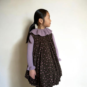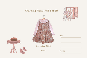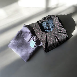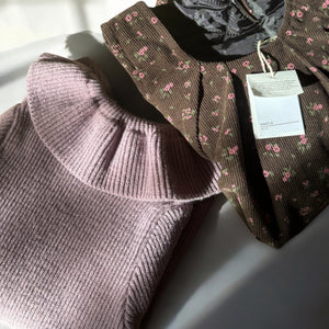 トップスは柔らかく伸縮性のあるリブニット素材で仕立てており、動きやすさと快適さを兼ね備えています。袖口と襟元にはフリルをあしらい、上品さと華やかさをプラス。くすみのある落ち着いたカラーリングが、スカートとの相性も抜群です。