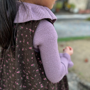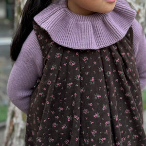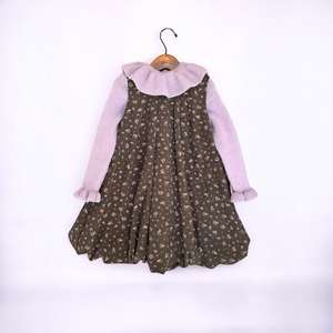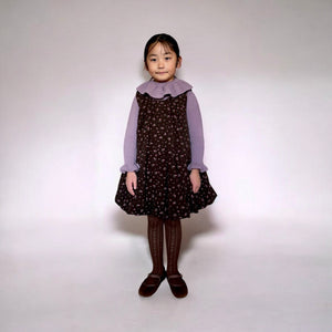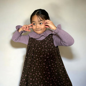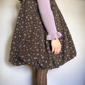 上品なブラウンのコーデュロイスカートに、小さなピンクの小花柄が愛らしく映えるデザイン
