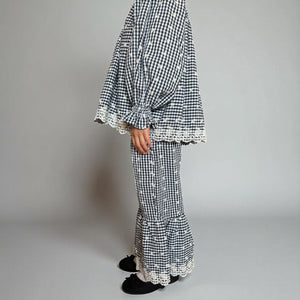 mutta.から、クラシカルなギンガムチェックに繊細なお花の刺繍とレースをあしらった、上品でレトロな雰囲気のコットン100%セットアップが入荷しました!