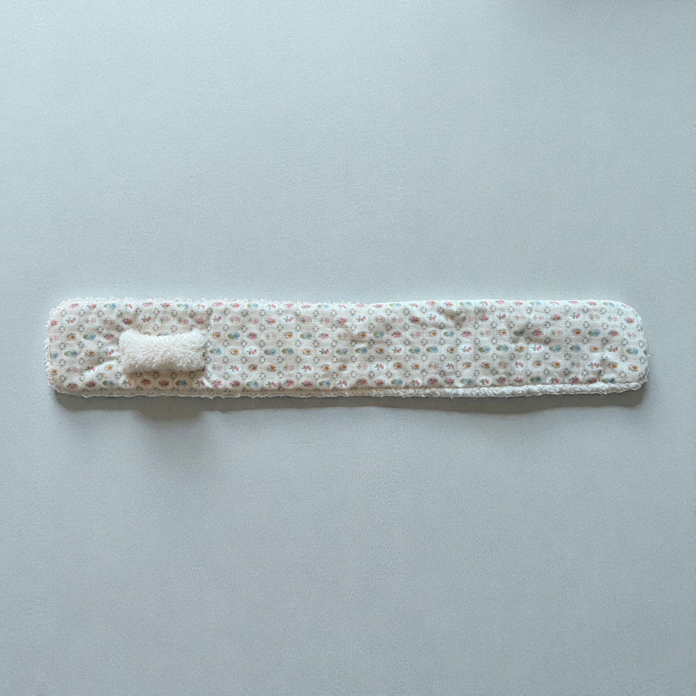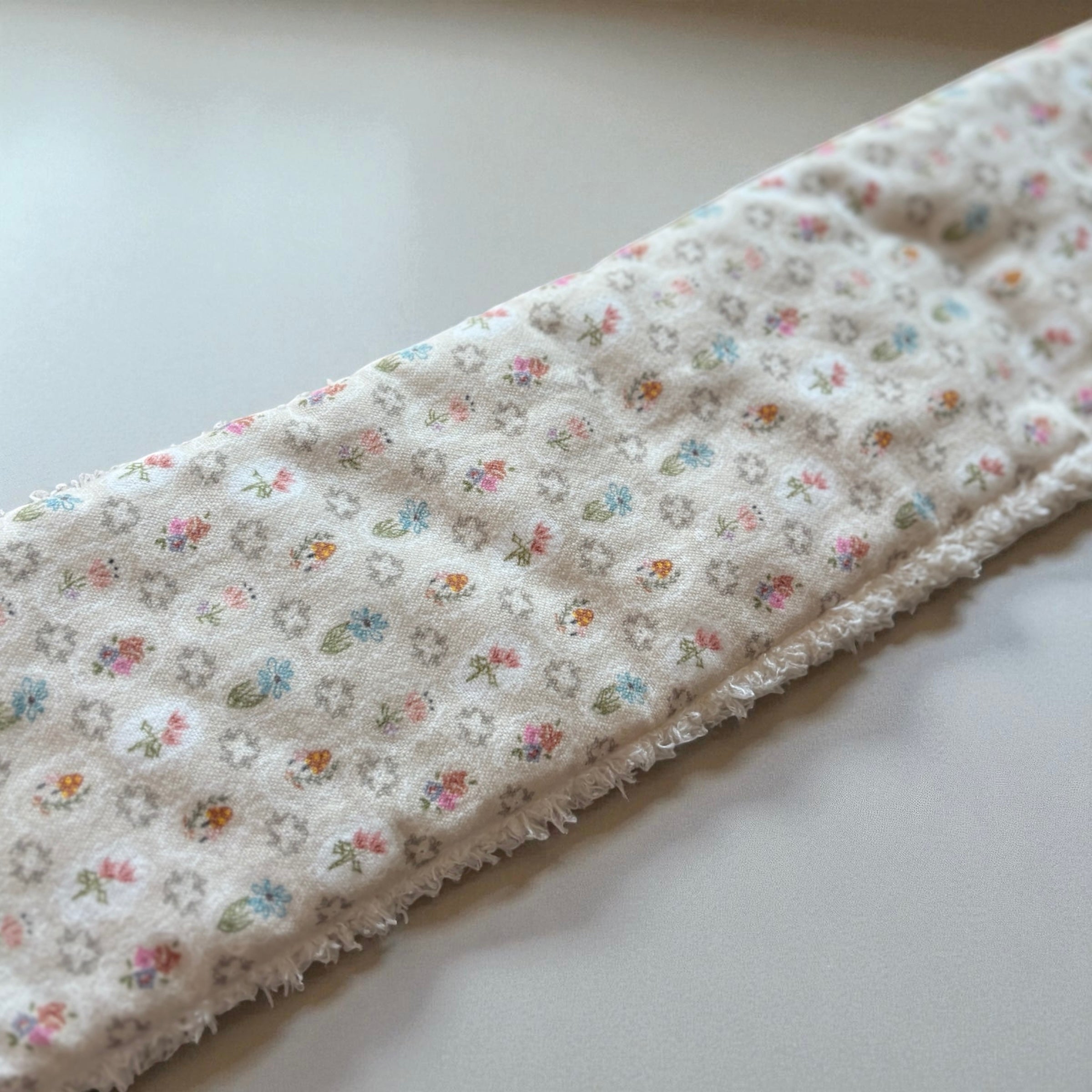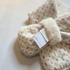 表は小花柄の柔らかいコットン、裏はふわっと暖かいボア素材で、軽いのにしっかり冬の寒さから守ってくれます。