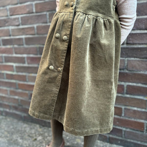 オリーブグリーンのコーデュロイ生地が上品さを引き立て、くるみボタンが優しいアクセントに。トップスのレース襟は、フラワーモチーフの刺繍で顔周りを華やかにし、特別な日にも日常にも使える万能アイテムです。