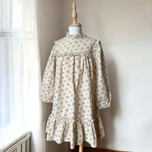mutta.の女の子向けの秋冬ワンピース。愛らしい小花柄をちりばめた上品なベージュカラーワンピース